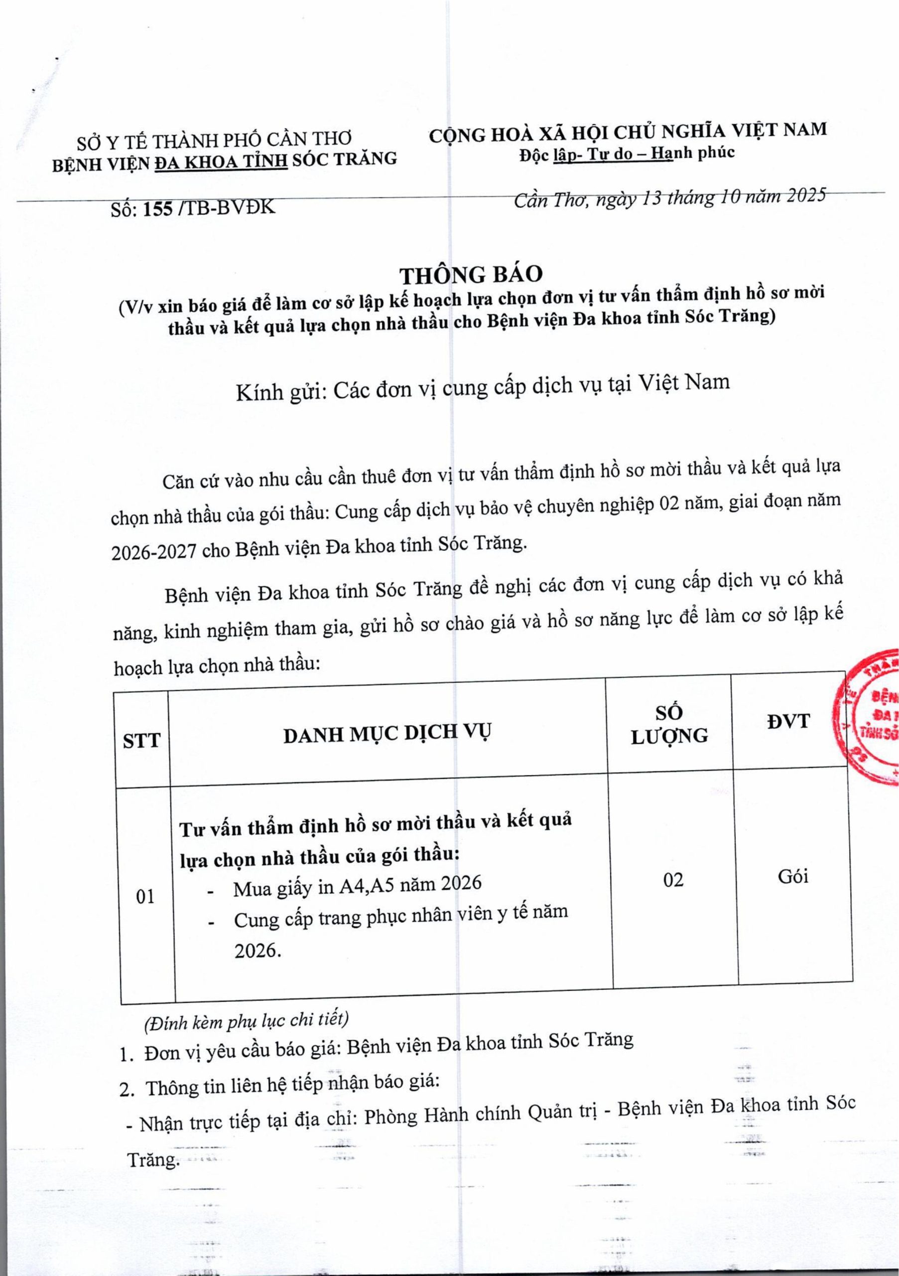 THÔNG BÁO Số 155/TB-BVĐK ngày 13/10/2025 V/v xin báo giá để làm cơ sở lập kế hoạch lựa chọn đơn vị tư vấn thẩm định hồ sơ mời thầu và kết quả lựa chọn nhà thầu cho Bệnh viện Đa khoa tỉnh Sóc Trăng