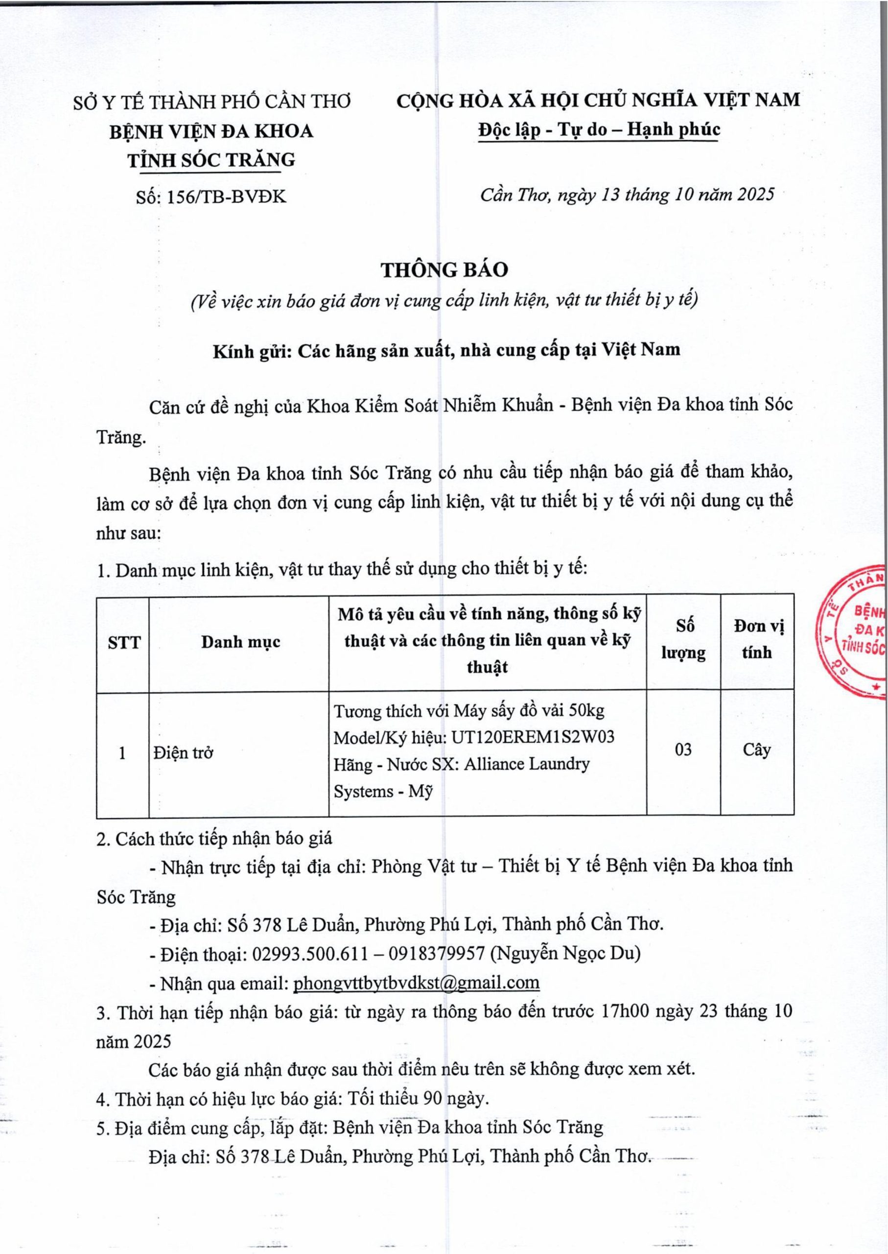 THÔNG BÁO Số 163/TB-BVĐK ngày 16/10/2025 V/v xin báo giá đơn vị cung cấp dịch vụ sửa chữa thiết bị y tế tại Bệnh viện Đa khoa tỉnh Sóc Trăng