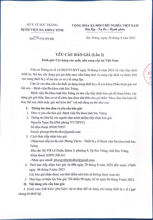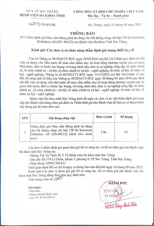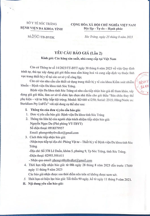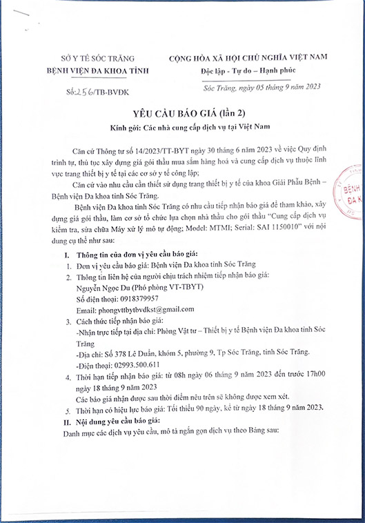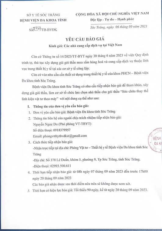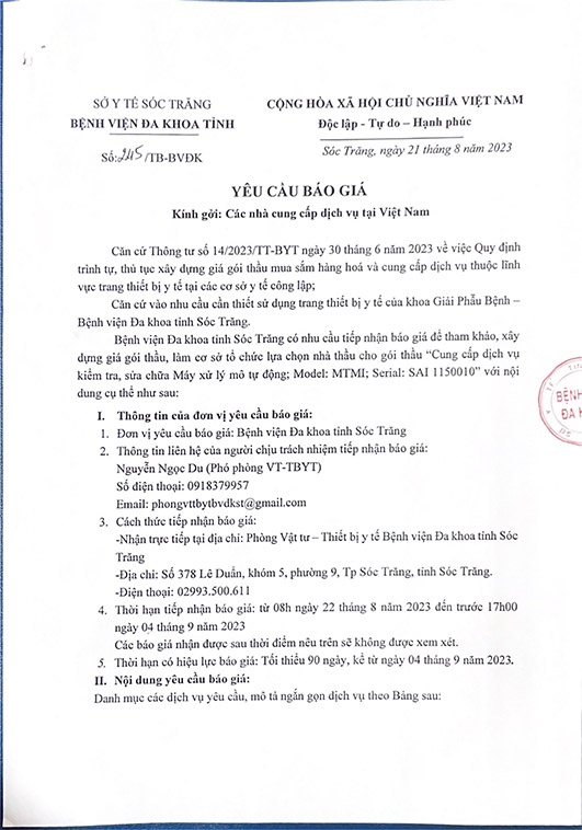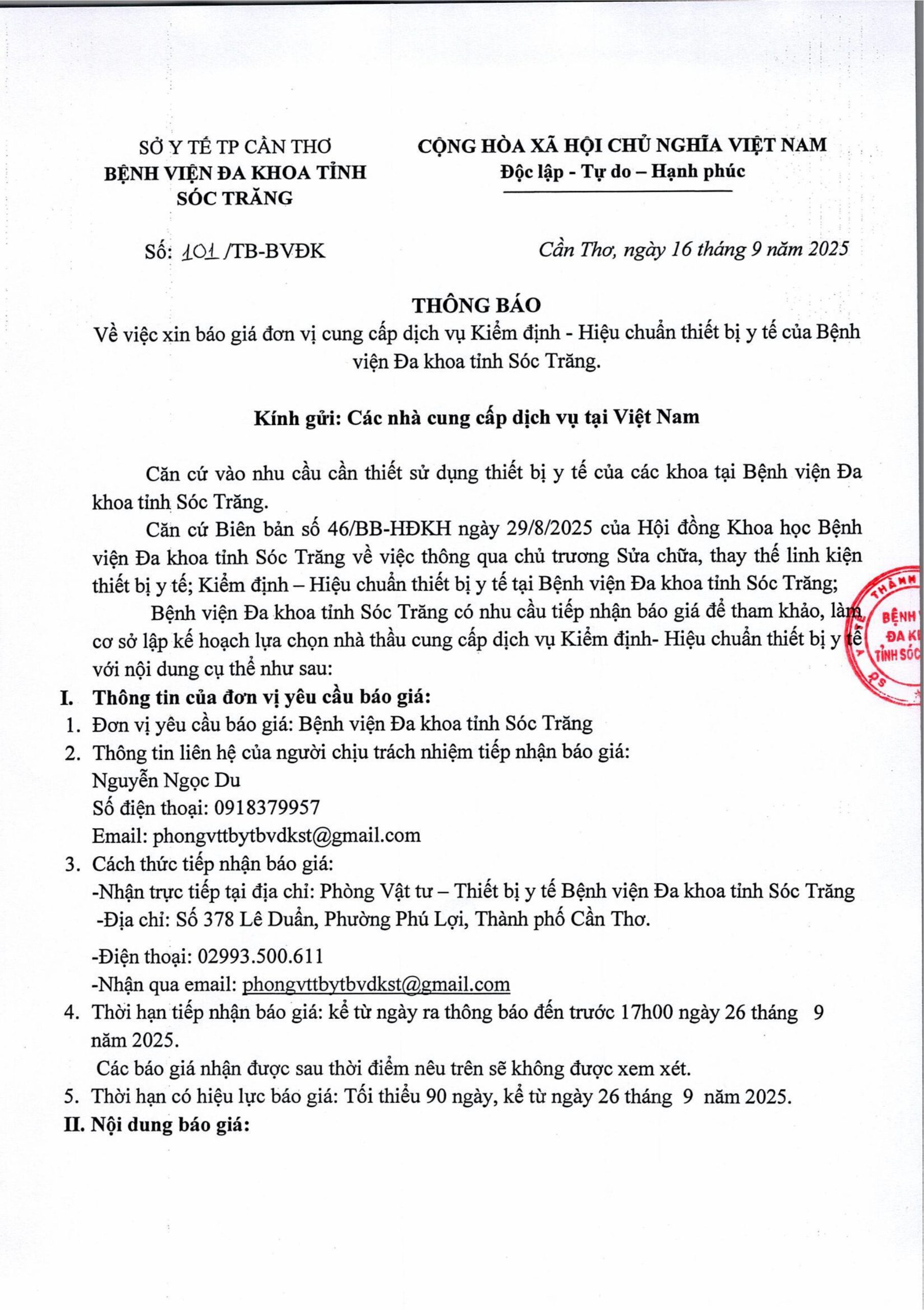 THÔNG BÁO Số 101/TB-BVĐK ngày 16/9/2025 V/v xin báo giá đơn vị cung cấp dịch vụ Kiểm định – Hiệu chuẩn thiết bị y tế của Bệnh viện Đa khoa tỉnh Sóc Trăng
