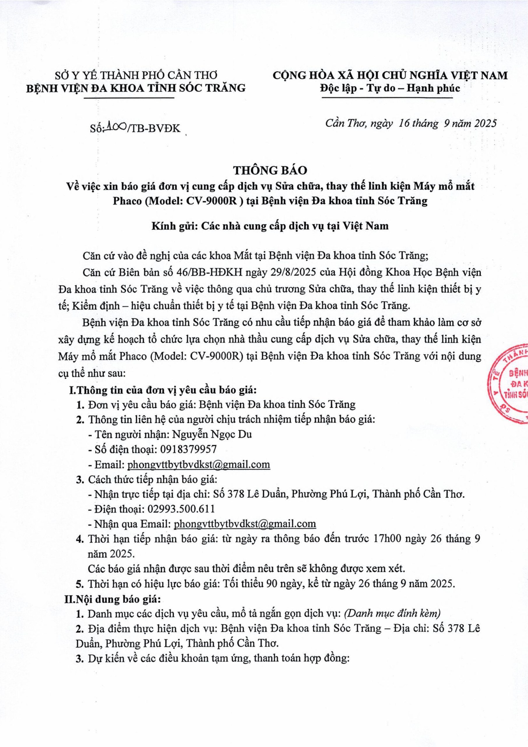 THÔNG BÁO Số 100/TB-BVĐK ngày 16/9/2025 V/v xin báo giá đơn vị cung cấp dịch vụ Sửa chữa, thay thế linh kiện Máy mổ mắt Phaco (Model: CV-9000R) tại Bệnh viện Đa khoa tỉnh Sóc Trăng
