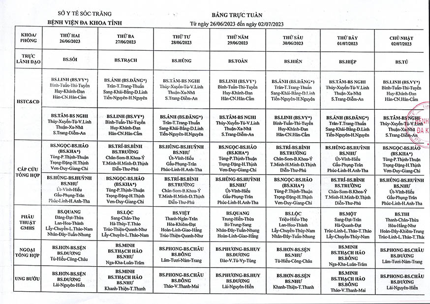 LỊCH TRỰC TUẦN TỪ NGÀY 26/6/2023 ĐẾN HẾT NGÀY 2/7/2023