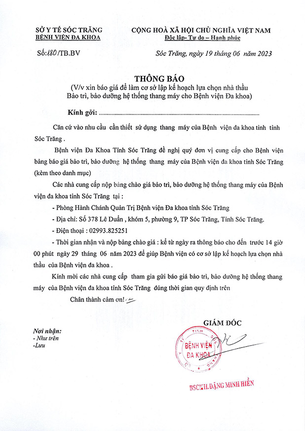 THÔNG BÁO v/v xin báo giá để làm cơ sở lập kế hoạch chọn nhà thầu Bảo trì, bảo dưỡng hệ thống thang máy cho Bệnh viện Đa khoa tỉnh Sóc Trăng