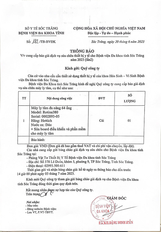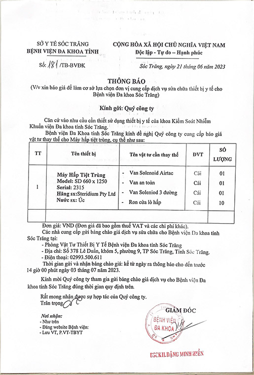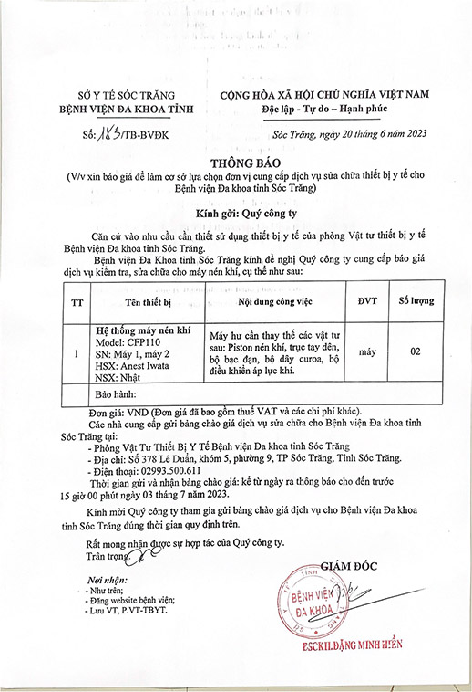 THÔNG BÁO v/v cung cấp báo giá dịch vụ sửa chữa thiết bị y tế cho Bệnh viện Đa khoa tỉnh Sóc Trăng năm 2023 (lần 2)