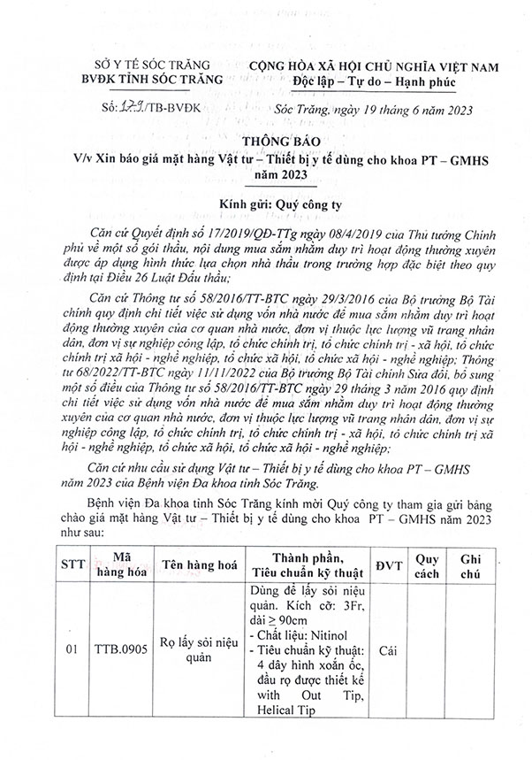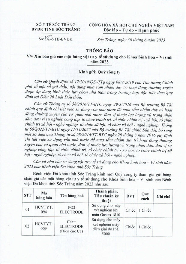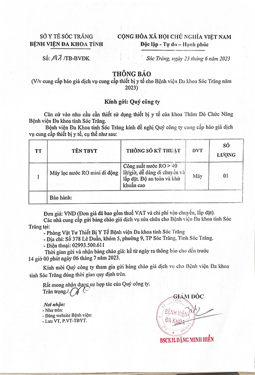 THÔNG BÁO v/v cung cấp báo giá dịch vụ cung cấp thiết bị y tế cho Bệnh viện Đa khoa Sóc Trăng năm 2023