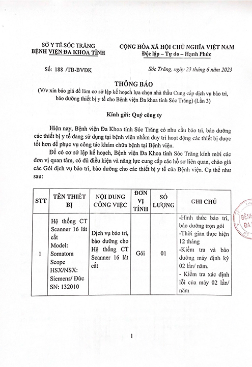 THÔNG BÁO v/v xin báo giá để làm cơ sở lập kế hoạch lựa chọn nhà thầu cung cấp dịch vụ bảo trì, bảo dưỡng thiết bị y tế cho Bệnh viện Đa khoa tỉnh Sóc Trăng