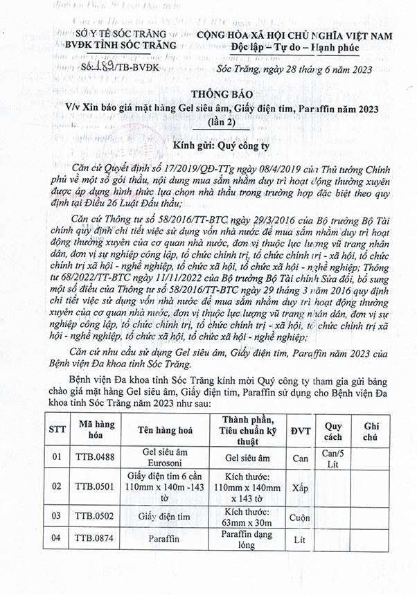 THÔNG BÁO v/v xin báo giá mặt hàng Gel siêu âm, giấy điện tim, Paraffin năm 2023 (lần 2)