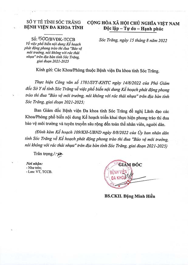 Lịch trực, Lịch trực - Lịch công tácCông văn số 500/BVĐK-TCCB ngày 15 tháng 8 năm 2022 về việc Phổ biến nội dung phát động Kế hoạch phong trào thi đua “Bảo vệ môi trường, nói không với rác thải nhựa” trên địa bàn tỉnh Sóc Trăng giai đoạn 2021 – 2025 15 Th8