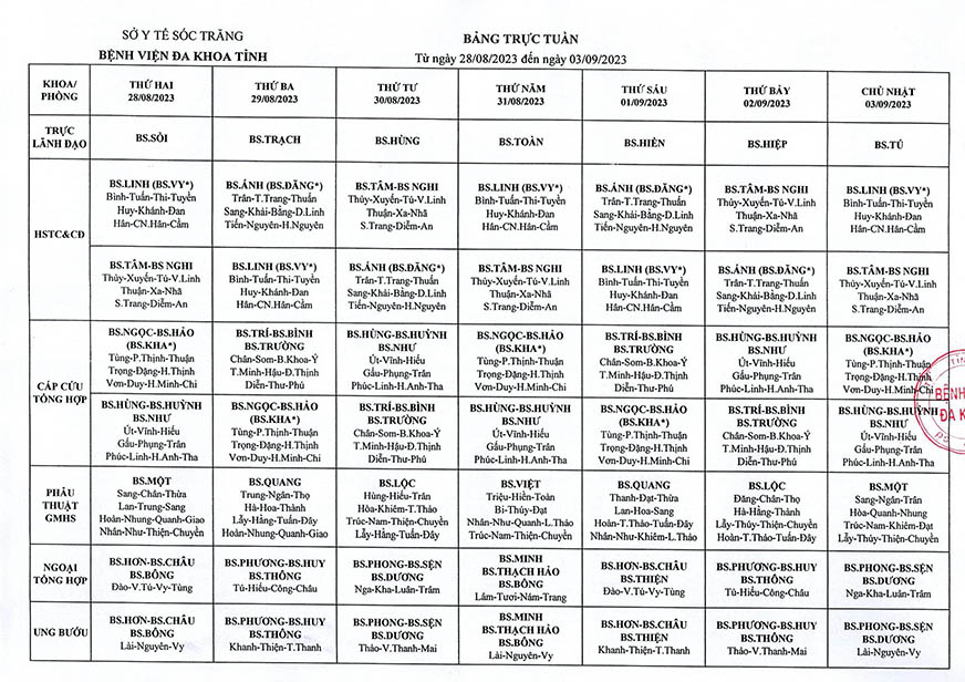 LỊCH TRỰC TUẦN TỪ NGÀY 28/8/2023 ĐẾN HẾT NGÀY 03/9/2023
