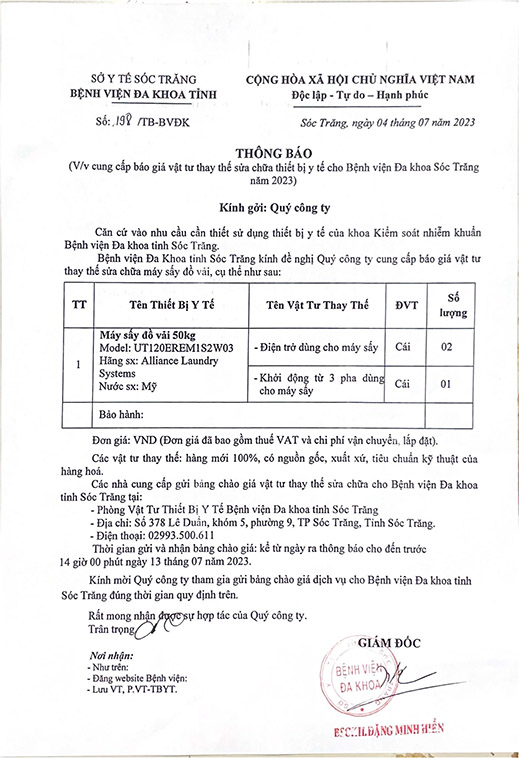 THÔNG BÁO Số 175/TB-BVĐK ngày 28/10/2025 V/v xin báo giá đơn vị cung cấp vật tư thiết bị y tế tại Bệnh viện Đa khoa tỉnh Sóc Trăng (Lần 02)