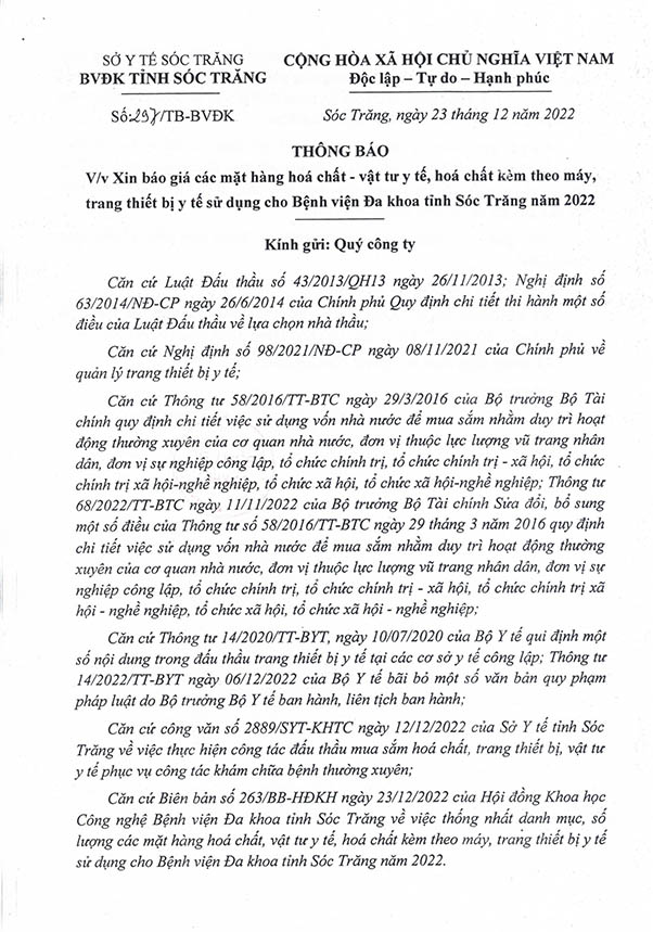 THÔNG BÁO Số 175/TB-BVĐK ngày 28/10/2025 V/v xin báo giá đơn vị cung cấp vật tư thiết bị y tế tại Bệnh viện Đa khoa tỉnh Sóc Trăng (Lần 02)