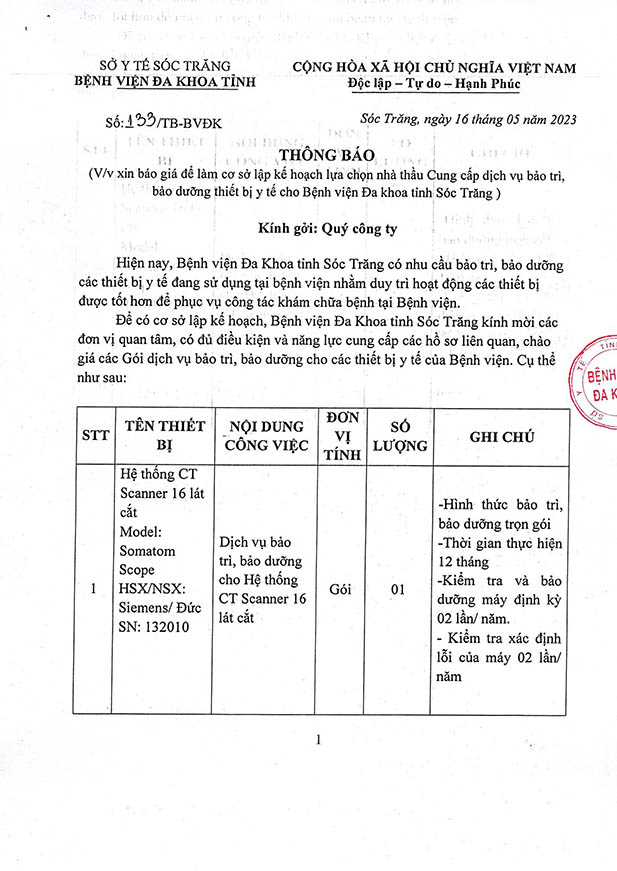 THÔNG BÁO Số 164/TB-BVĐK ngày 17/10/2025 V/v xin báo giá đơn vị cung cấp dịch vụ sửa chữa thiết bị y tế tại Bệnh viện Đa khoa tỉnh Sóc Trăng
