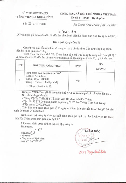 Thông tin dịch vụTHÔNG BÁO v/v xin báo giá sửa chữa đầu dò siêu âm cho Bệnh viện Đa khoa tỉnh Sóc Trăng năm 2023 17 Th4