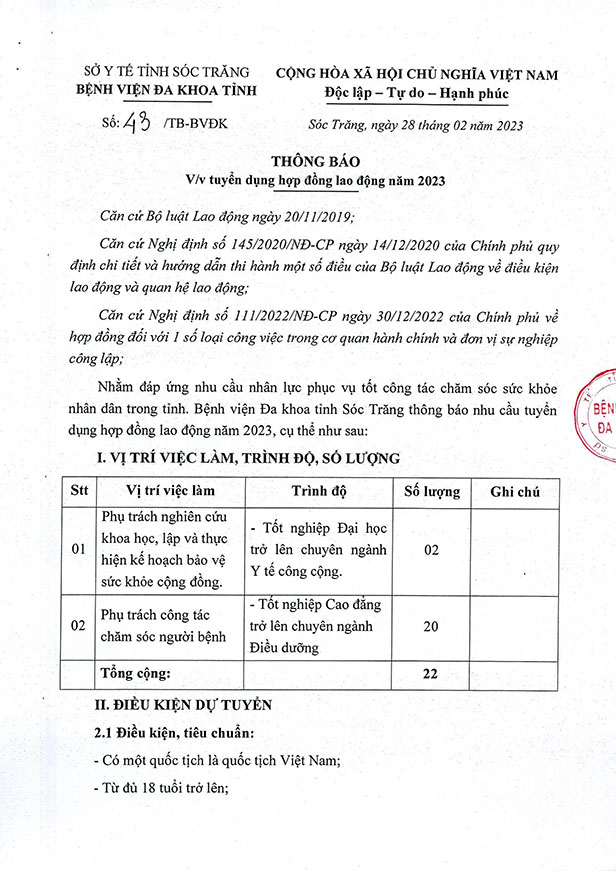 THÔNG BÁO VỀ VIỆC TUYỂN DỤNG HỢP ĐỒNG LAO ĐỘNG NĂM 2023