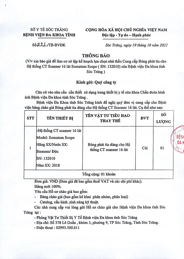 Thông tin dịch vụTHÔNG BÁO VỀ VIỆC XIN BÁO GIÁ ĐỂ LÀM CƠ SỞ LẬP KẾ HOẠCH LỰA CHỌN NHÀ THẦU CUNG CẤP BÓNG PHÁT TIA CHO HỆ THỐNG CT SCANNER 16 LÁT SOMATOM SCOPE 19 Th10