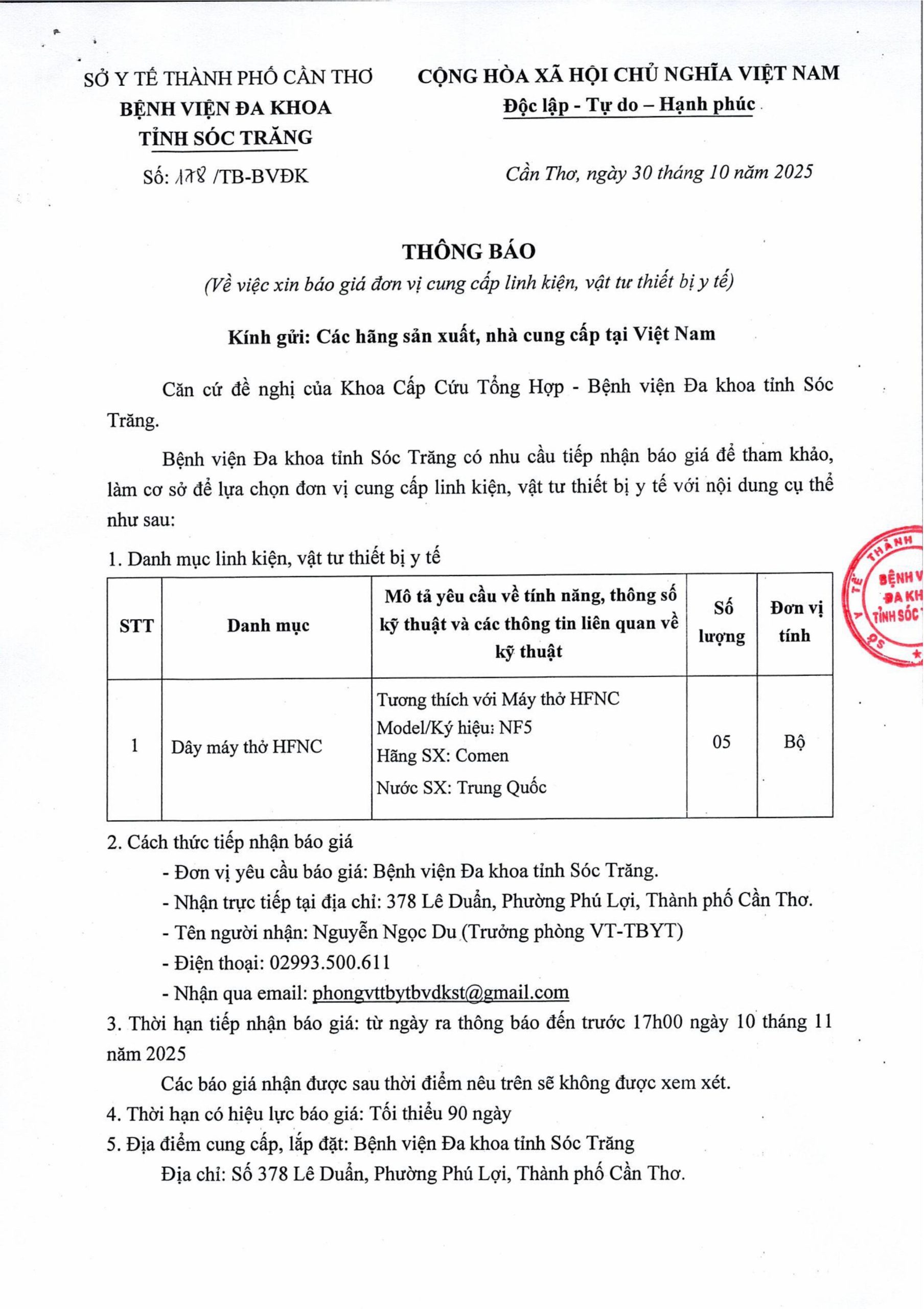 THÔNG BÁO Số 175/TB-BVĐK ngày 28/10/2025 V/v xin báo giá đơn vị cung cấp vật tư thiết bị y tế tại Bệnh viện Đa khoa tỉnh Sóc Trăng (Lần 02)