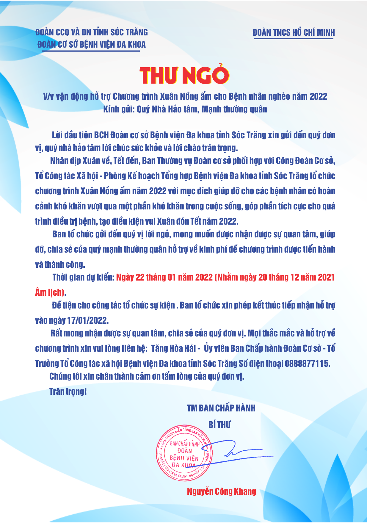 Tiếp nối thành công của Chương trình Xuân Nồng ấm hàng năm. Bệnh viện Đa khoa tỉnh Sóc Trăng tiếp tục tổ chức Chương trình năm 2022. Rất mong Quý Mạnh thường quân, Quý Nhà hảo tâm đồng hành cùng với Bệnh viện Đa khoa tỉnh Sóc Trăng để mang đến cho bệnh nhân có hoàn cảnh khó khăn tại Bệnh viện có một mùa xuân thêm đong đầy tình thương, tiếp thêm sức mạnh vượt qua khó khăn, bệnh tật.