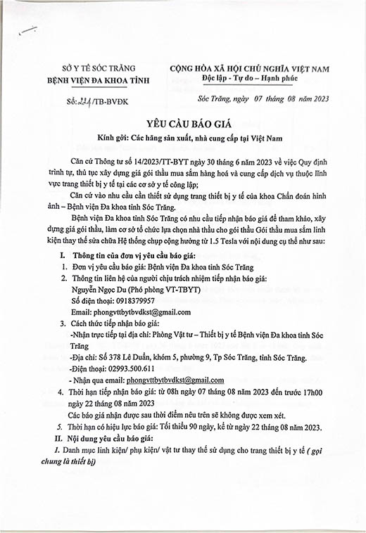 THÔNG BÁO Số 164/TB-BVĐK ngày 17/10/2025 V/v xin báo giá đơn vị cung cấp dịch vụ sửa chữa thiết bị y tế tại Bệnh viện Đa khoa tỉnh Sóc Trăng